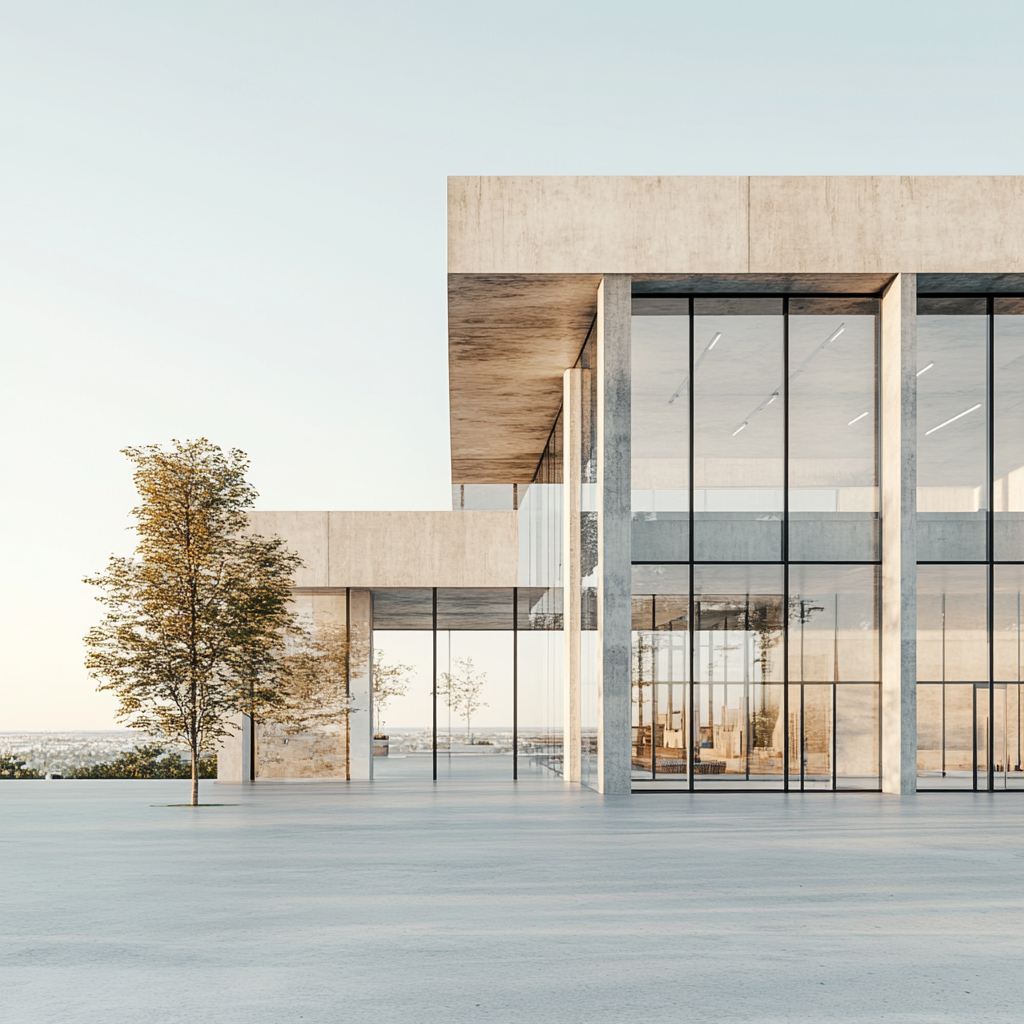 A high-resolution, realistic 3D-rendered image of a modern reinforced concrete building. The structure showcases strong concrete pillars, wide glass windows, and a minimalist architectural design. The exterior is sleek with exposed concrete surfaces, giving an industrial yet elegant look. Sunlight casts soft shadows, highlighting the texture of the reinforced concrete. In the background, a clear blue sky and a well-maintained urban landscape complement the modern aesthetic. The image should emphasize the strength, durability, and architectural beauty of reinforced concrete structures.
